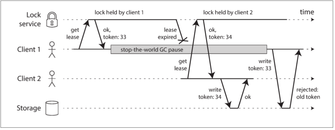 Above figure shows that issue arises when a client obtains a lease but experiences a prolonged pause due to garbage collection (GC), causing the lease to expire. During this time, another client acquires the lease and writes to the same file.