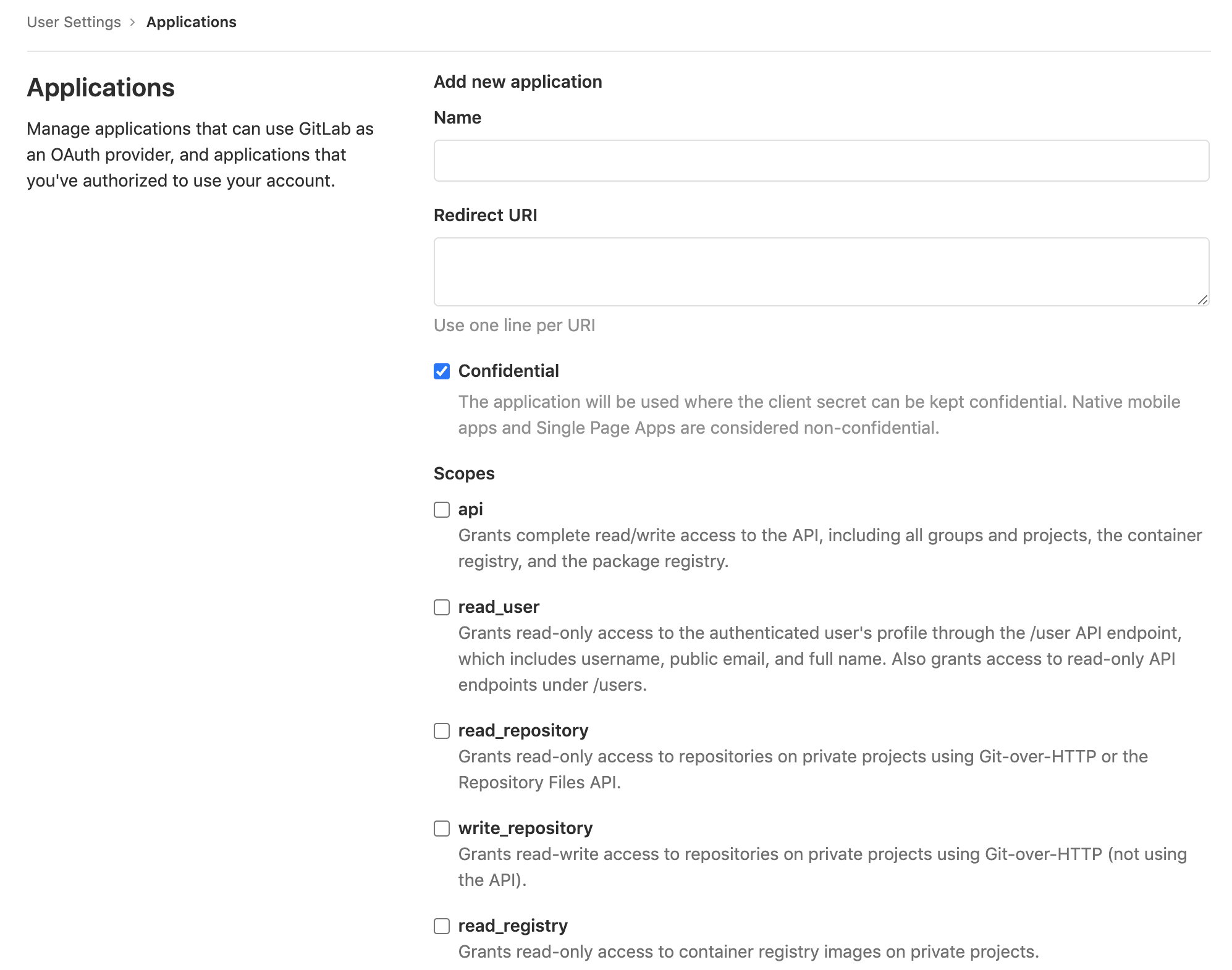 第一步,先去Gitlab上建置相關的application,並且設定該application所需要的權限。