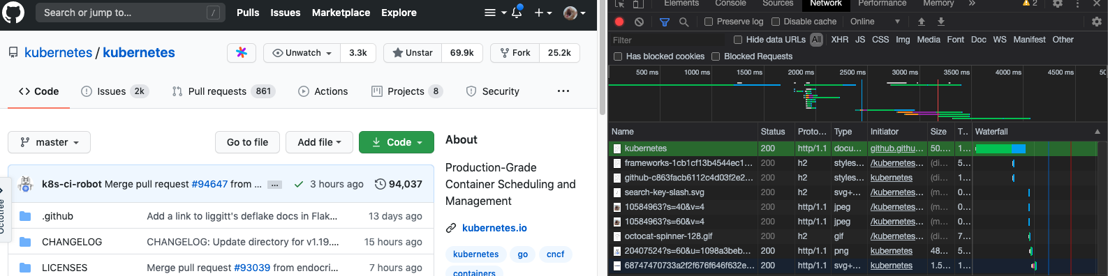 當我們開啟 dev mod 的時候存取 github 的頁面可以觀察到有許多的請求是透過http2完成的,如下圖所示。