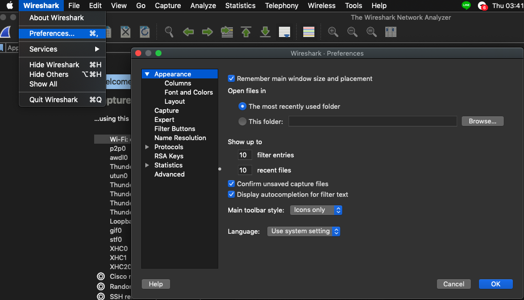 開啟 wireshark 後點選wireshark 選擇 Preferences 打開設定頁面,如下圖所示。