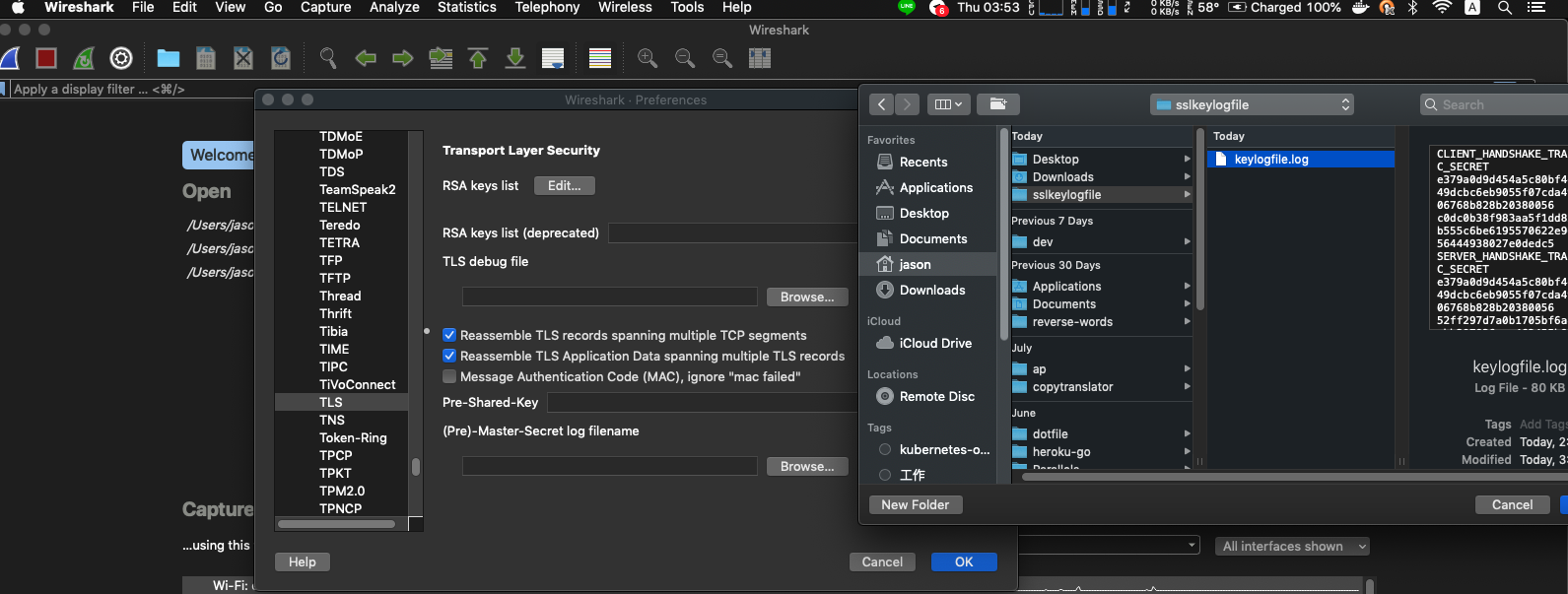 接著選擇 Protocols -> TLS -> (Pre)-Master-Secret log filename 把~/sslkeylogfile/keylogfile.log 放進去。