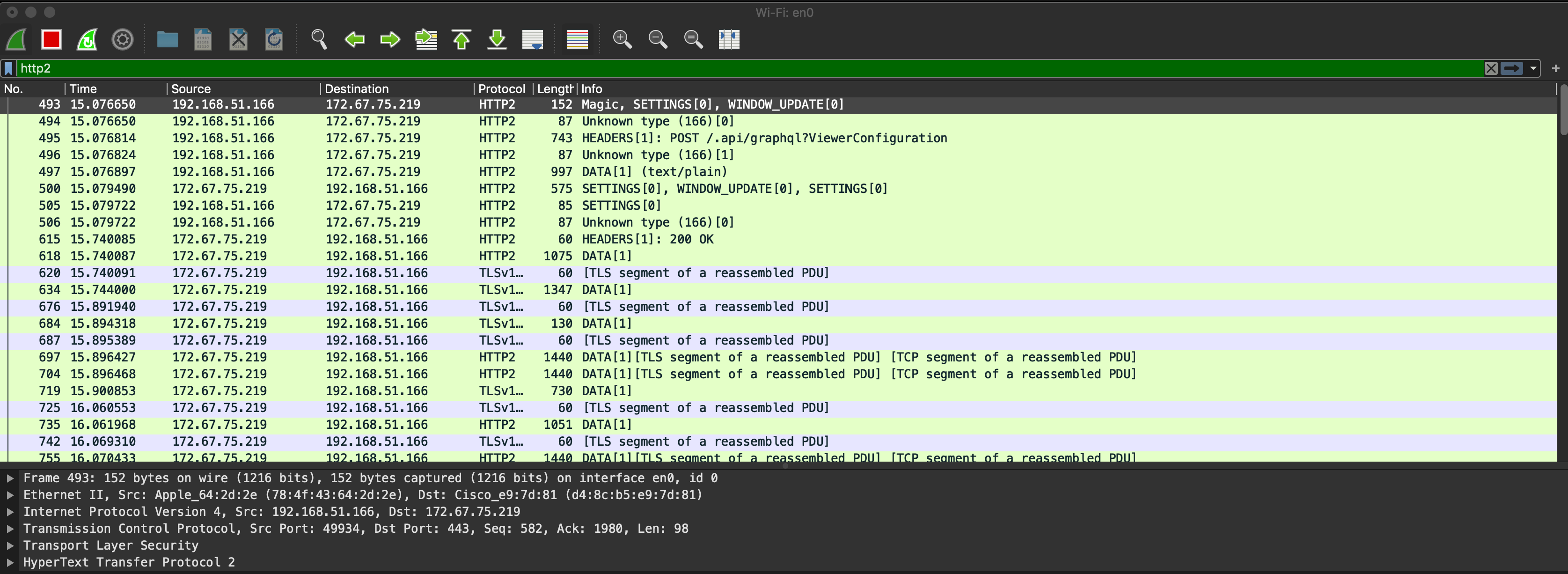 原因出在瀏覽器存取服務的時候需要透過基於 TLS 的 Http2 protocal ,所有的資料都被加密了我們不能看到 Client server 之間到底溝通了什麼,解決的方法其實很簡單只要在瀏覽器 Chrome 設定 SSLKEYLOGFILE 就可以順利的從 Chrome 抓到 http2 封包了。